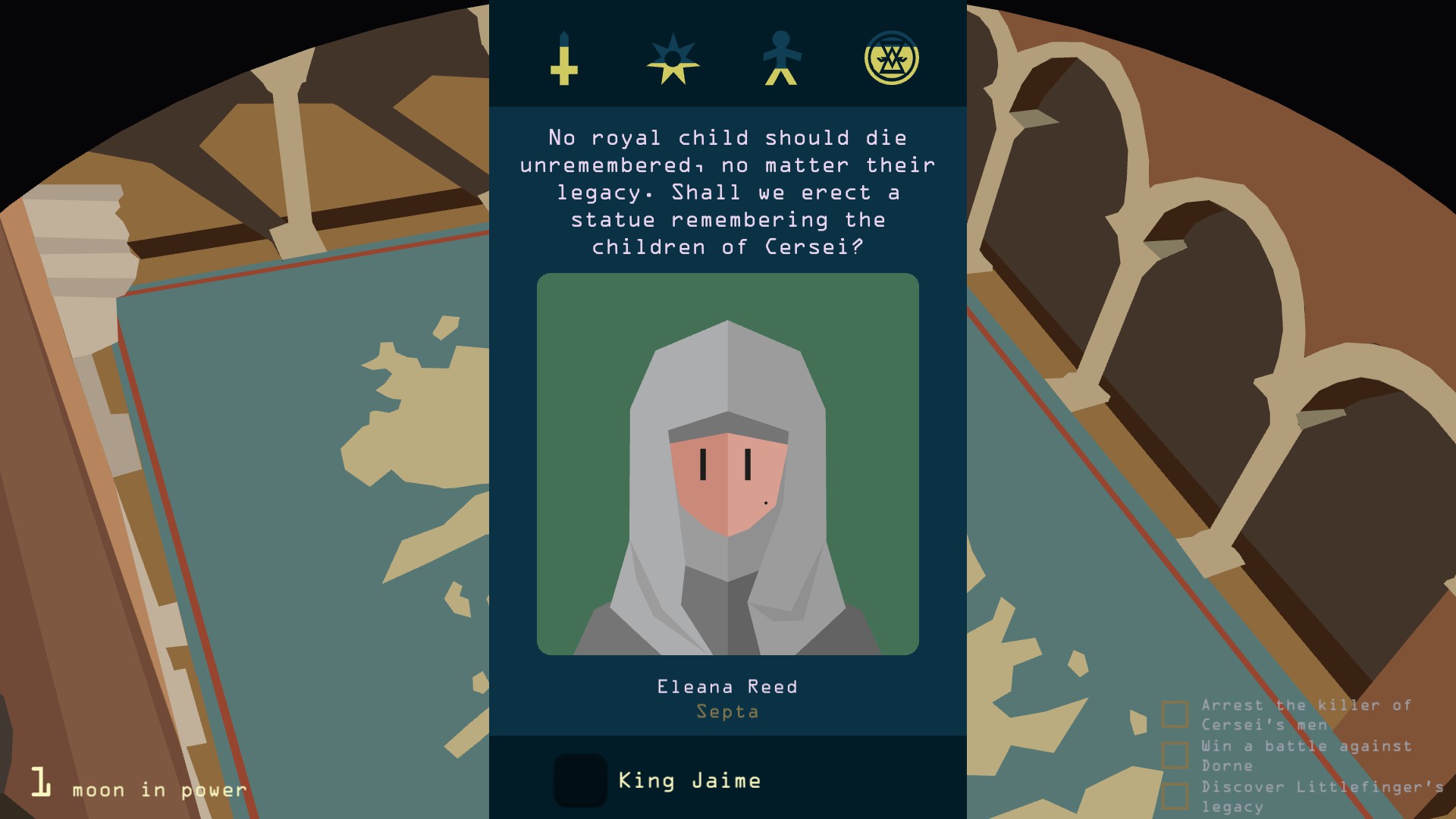 No i w końcu dochodzimy do kwestii, która jest powodem, dla którego zdecydowałem się jeszcze raz tę grę zrecenzować. Jak prezentuje się Reigns: Game of Thrones jako produkcja skierowana do fana prozy Martina. I obawiam się, że nie mam pod tym względem dobrych wiadomości. Owszem, gra ma sporą porcję humoru. Podoba mi się jej minimalistyczna, mocno oparta na serialu oprawa graficzna. Ale to, co naprawdę ważne, nastrój intrygi, odsłanianie tajemnic stojących za wydarzeniami z serialu, okazało się być tylko sztuczką. Fasadą. Gra udaje na przykład, że przedstawi nam jakieś tajemnice dotyczące trzynastego Lorda Dowódcy Nocnej Straży, ale ostatecznie okazują się to być kompletne błahostki. Zupełnie jakby istniał kierunek, w którym chcieli pchnąć fabułę gry, ale ostatecznie powstrzymał ich łańcuch licencji. Na domiar złego bardzo mocno odczuwalny jest fakt, że gra obraca się w realiach serialowych, kompletnie lekceważąc książki. Kilka razy aż prosi się o nawiązania do historii Westeros, o jakiej można przeczytać w powieściach Martina, ale twórcy gry nie chcą iść w tym kierunku. A może nawet nie wiedzą, że kierunek ten istnieje. Przyglądając się nazwiskom postaci drugoplanowych stworzonych na użytek gry, szybko zrozumiemy bowiem, że nie mają pojęcia o różnicach kulturowych pomiędzy poszczególnymi królestwami. A ikonografia dowiedzie, że nie rozumieją różnic pomiędzy religiami Westeros.