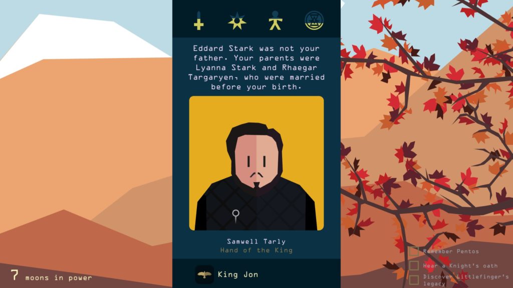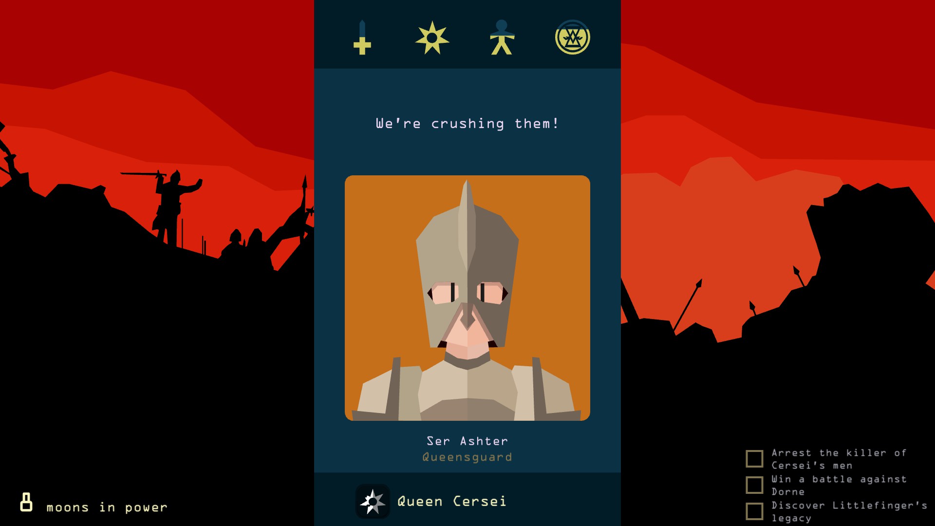 Nie wszyscy bohaterowie gry są też właściwymi monarchami, choć we wszystkich przypadkach działa ta sama mechanika zachowywania równowagi (tudzież unikania oczywistych zasadzek kryjących się w kartach. Nie jest to takie proste, bo związki pomiędzy możliwymi wyborami a ich konsekwencjami są często nieoczywiste. Prędzej czy później oczywiście je rozgryziemy – rozegrawszy kilkanaście partyjek gry. Ale będzie to miało charakter nauki pamięciowej. W trakcie gry, wypełniając swego rodzaju „misje” (sprecyzowane w prawym dolnym rogu), będziemy odblokowywać nowe pakiety kart oraz nowe postaci i ich „mini-kampanie” (bohaterów jest ósemka – Daenerys, Jon Snow, Cersei, Sansa, Jaime, Tyrion, Gendry, Arya i na dokładkę Trójoka Wrona… a właściwie to chyba Kruk, bo takie przezwisko nosił w serialu).