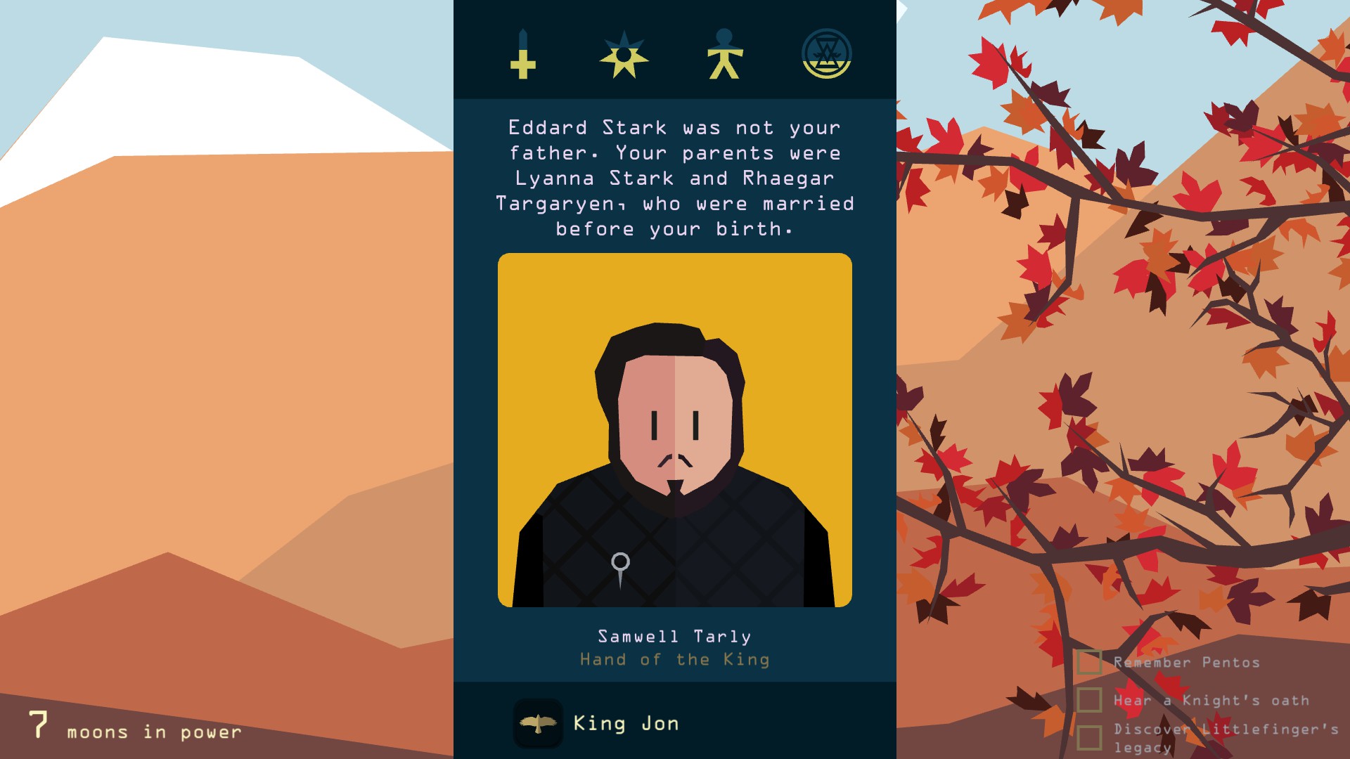 Reigns doczekało się też spin-offów. Pierwszym była gra Reigns: Her Majesty koncentrująca się na wyzwaniach stojących przed królowymi. Druga powstała na licencji Gry o Tron i pozwoliła nam wcielić się w jednego z bohaterów serialu. Produkcję tę opisałem w krótkiej recenzji w CD-Action ponad 2 lata temu, ale mam wrażenie, że pominąłem tam kwestię dość istotną – to mianowicie, jaką wartość gra przedstawia dla fanów książek i serialu. Chciałbym więc wrócić na chwilę do gry i spojrzeć na nią jeszcze raz, świeżym okiem, już po zakończeniu serialu.