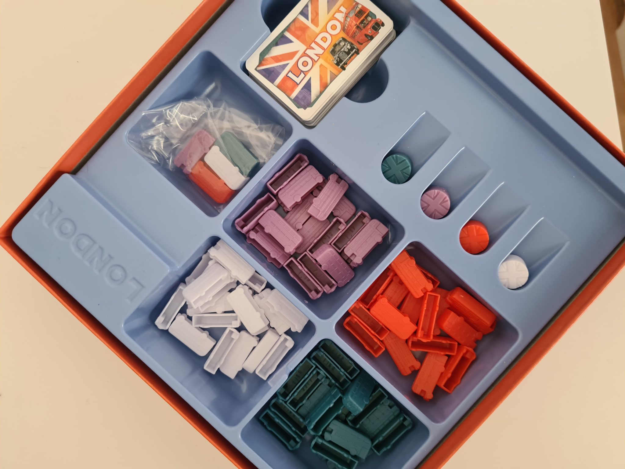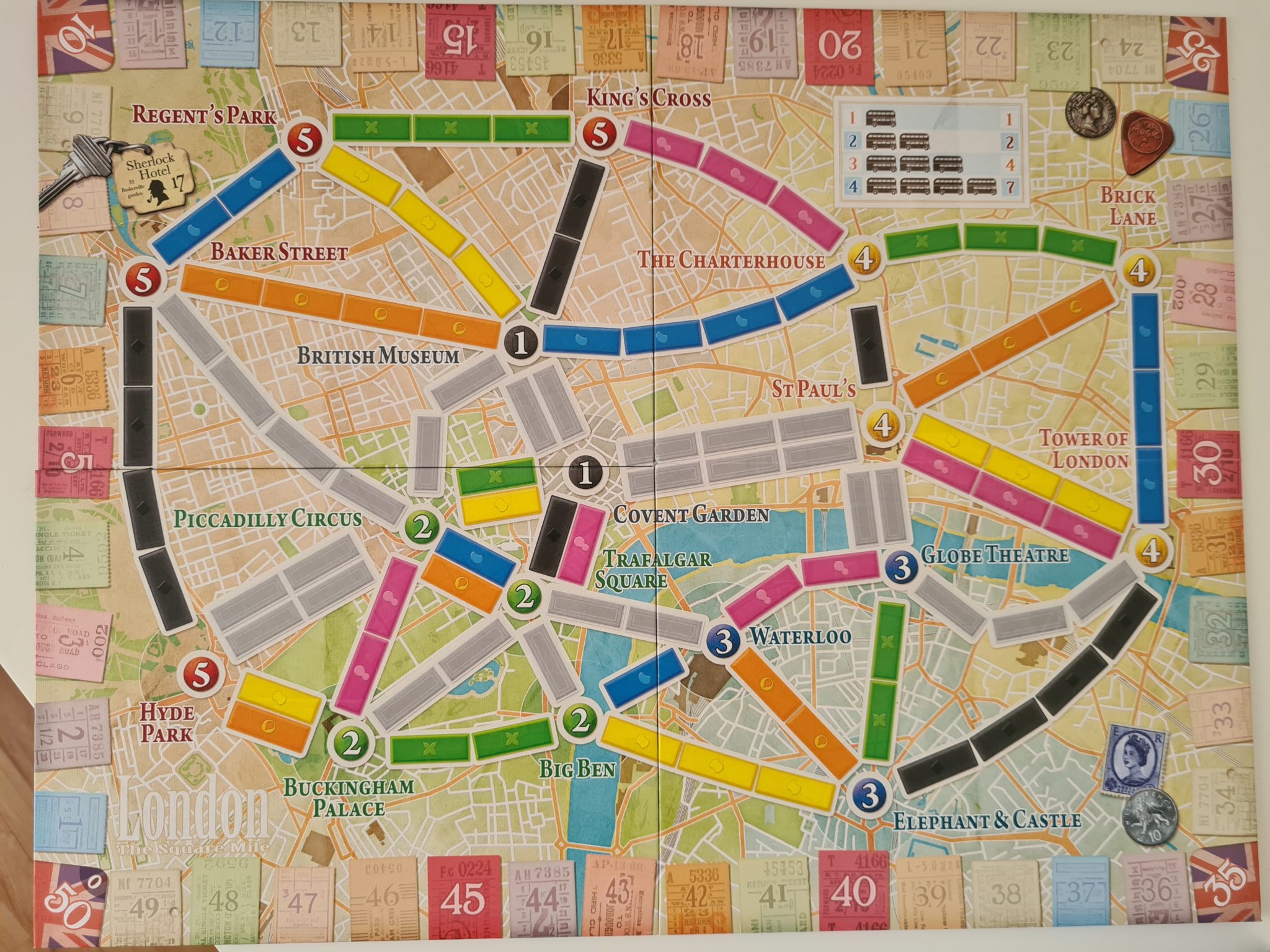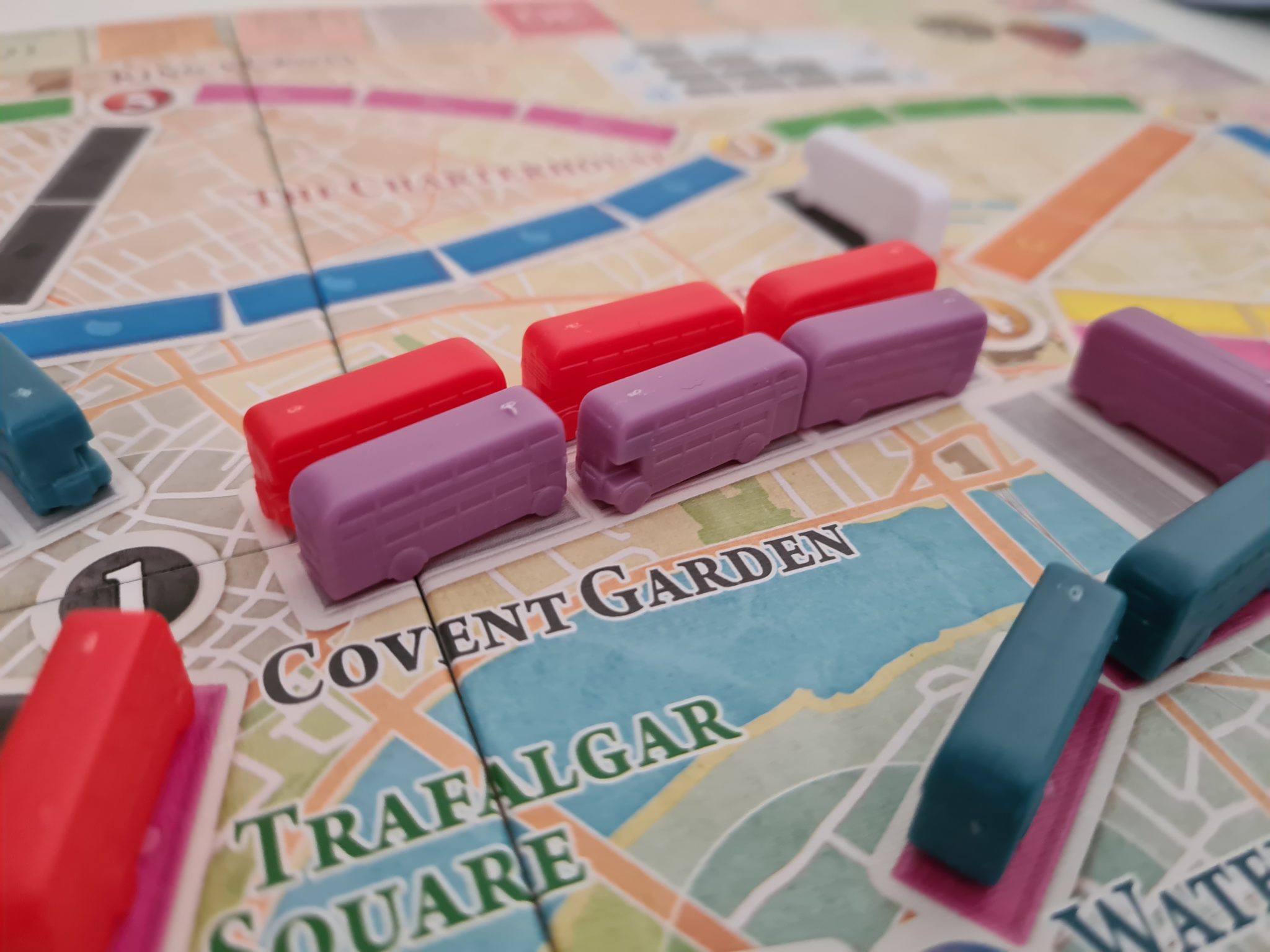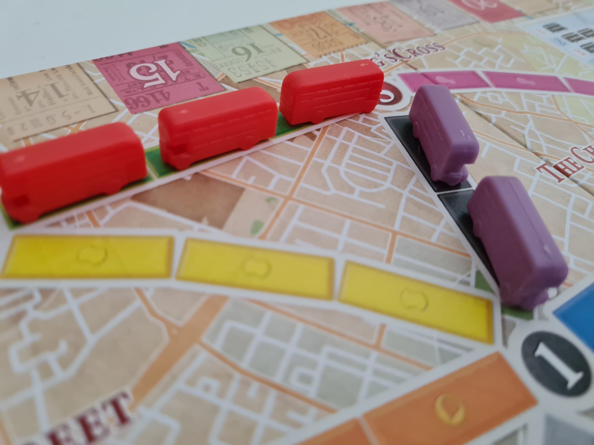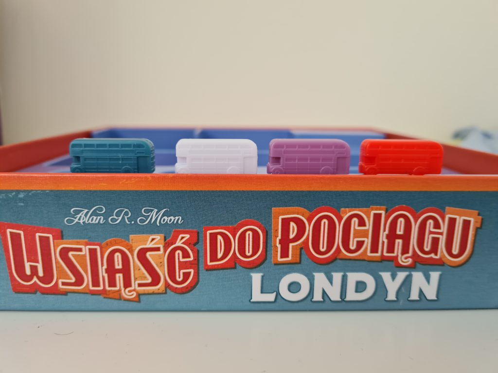 Recenzję zacznijmy od opisu wykonania gry. To, jak przystało na wydawnictwo „Days of Wonder”, stoi na wysokim poziomie – fantastyczne modele wago… autobusów, dobrej jakości karty i gruba plansza bezproblemowo znajdują miejsce w świetnie zaplanowanej wyprasce. Dodatkowo pudełko, karty pojazdów jak i mapa okraszone są świetnymi grafikami oddającymi klimat Anglii i Londynu. Można przyczepić się do pewnych drobnostek takich jak rozmiar kart czy też jakość znaczników punktów, niemniej uważam iż byłoby to szukanie dziury w całym. Bo choć nie ma tu niczego, co powalałoby na kolana swoją jakością, to żaden z elementów nie schodzi poniżej bardzo solidnego poziomu. To wszystko sprawia, iż wrażenia organoleptyczne (ale mam nadzieję, że nie smakowe – przyp. DaeL) związane z obcowaniem z grą są w pełni zadowalające. Za polskie wydanie odpowiada wydawnictwo „Rebel”, więc tutaj również nie ma absolutnie żadnego pola do narzekań.