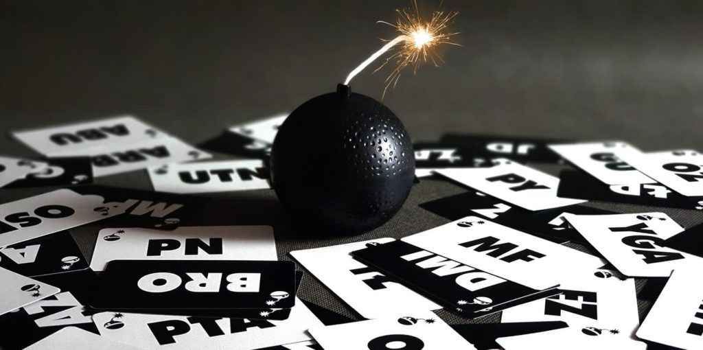 W pudełku znajdziemy zestaw 110 kart z literami. Na obu stronach każdej z kart jest inna grupa liter. Ponadto jest tam kostka do gry z trzema różnymi obrazkami, które ustanawiają kategorię wyrazową w danej rundzie. Dostajemy też małą bombę na baterię odliczającą czas od 10 do 60 sekund (czas jest ustalany losowo). Cel gry, jak można się domyślić, jest banalnie prosty, każdy z uczestników ma za zadanie ułożyć wyraz, zawierający podaną grupę liter na karcie zgodnie z jedną z trzech kategorii, przed upływem czasu i wybuchem bomby.