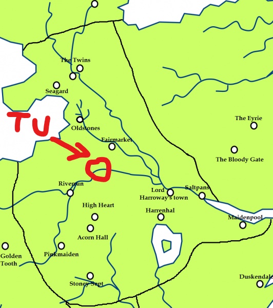 Dobra z tą lokalizjacją to chyba przesadziliście, albo widzimy tu problem/niedociągnięcie u Martina. Przy tej gospodzie Torhen Stark klęknął przed Aegonem zdobywcą gdy przekroczył Trident, tak? No to gdzie go przekroczył, nie ma snic wspomniane o tym że przekroczył go w bliżniakach zdobył je. Wieć musimy domyśleć się że zrobił to nieopodal zamku Darrych, tam gdzie doszło do bitwy nad Tridentem. Dlatego wydaje mi się że historia karczmy albo jest zmyślona, albo mamy ty błąd Martina, lub coś wam nie wyszło z tą lokalizacją.