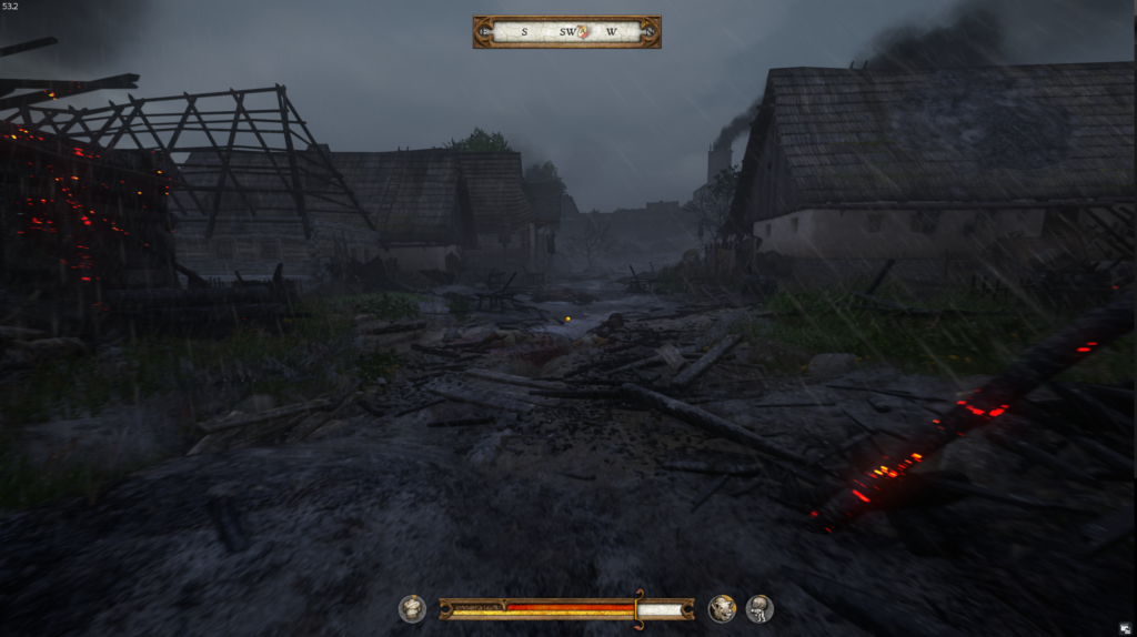 Tym, czym Kingdom Come przyciągnie waszą uwagę na dłużej, jest również nowe spojrzenie na system walki. Ciosy możemy zadawać (i otrzymywać) z pięciu kierunków przez pięć głównych rodzajów broni: długi i krótki miecz, młot bojowy, topór i kordelas. Do tego dochodzi jeszcze łuk i opcjonalnie tarcza. Gdzie jest haczyk? Cały system walki można określić jako: ‘’easy to learn, difficult to master’’. Mimo to, że szybko poznacie podstawy, przez pierwsze 20-25 godzin kampanii będziecie skakać wokół przeciwnika, licząc tylko i wyłącznie na kontrataki. Jeden źle wymierzony atak to gwarancja utraty połowy punktów życia. A mówimy tutaj tylko o walce jeden na jednego. Możecie absolutnie zapomnieć o najeżdżaniu wrogich obozów w pojedynkę – przynajmniej przed rozegraniem 50 godzin, zdobyciem świetnego uzbrojenia i po prostu nabyciem doświadczenia. Dwóch, trzech przeciwników, którzy atakują jednocześnie, to po prostu pewna śmierć. To samo tyczy się turniejów – jestem człowiekiem, który stara się podążać przez życie w sposób stoicki, lecz dosłownie rozwaliłem klawiaturę przez źle wyprowadzony atak, który kosztował mnie porażkę, zarówno w rundzie jak i w całym turnieju.