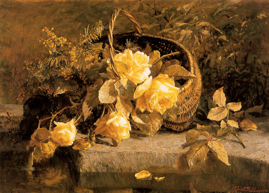 Gerardina Jacoba van de Sande Bakhuyzen (1826-1895), “Martwa natura z kwiatami w koszu nad brzegiem wody” (Wikimedia Commons).