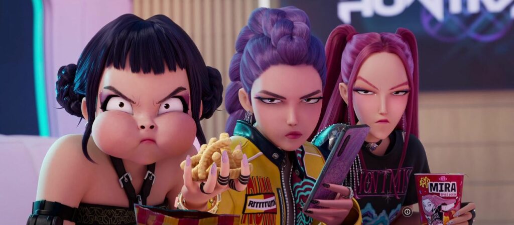 Wszystkie dziewczyny to przebojowe i silne babki – ale silne w ten faktyczny, ludzki sposób. Błyszczą na koncercie, dają z siebie wszystko tłukąc demony, a na koniec dnia zmywają makijaż, wskakują w dresy i marzą o wieczorze w towarzystwie wygodnej kanapy, TV i przekąsek. W przeciwieństwie do „silnych” kobiet-wydmuszek-babochłopów z Hollywood nie są idealne 24/7, są po prostu sobą, ze wszystkimi swoimi urokami i przywarami. Tak, to film z gatunku „girl power”, ale dla odmiany zrobiony dobrze. Fajnie pokazano też ich stosunek do antagonisty, czyli Saja Boys. Dziewczyny są w pełni świadome, że ich konkurencja to profesjonaliści ze sporą dozą talentu, i za to ich – niechętnie bo niechętnie – podziwiają.