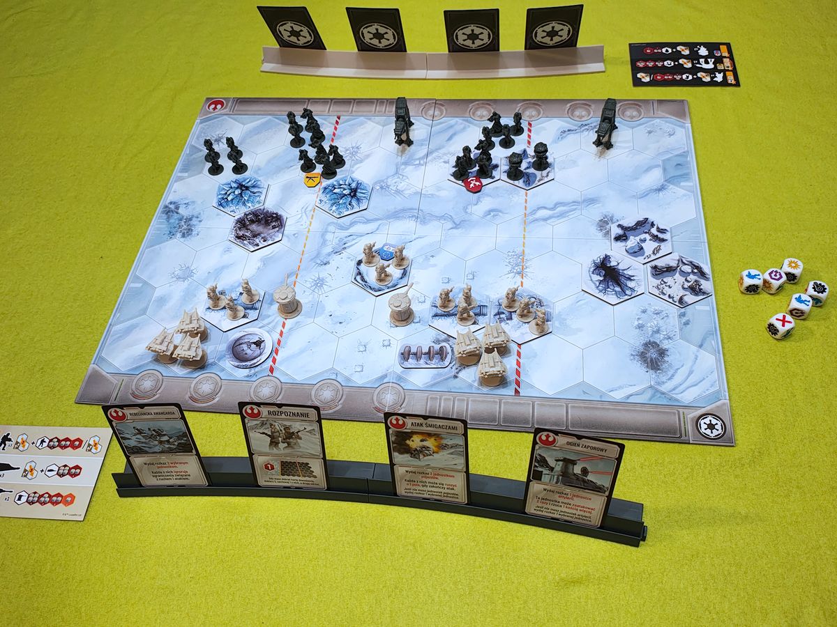 Z perspektywy graczy, którzy lubią pełną kontrolę i wyliczanie wszystkiego co do jednego punktu, będzie to zapewne największy minus gry. Po prostu trzeba zaakceptować, że czasem statystyka nie zadziała na naszą korzyść, a wynik scenariusza rozstrzygnie się przez jeden czy dwa spektakularne rzuty. Z drugiej strony – to właśnie ta losowość sprawia, że Bitwa o Hoth świetnie nadaje się do gry z młodszymi. Musicie uwierzyć na słowo, ale powalenie wspomnianego AT-AT wywołuje przy stole naprawdę żywiołowe reakcje i to z obu stron.