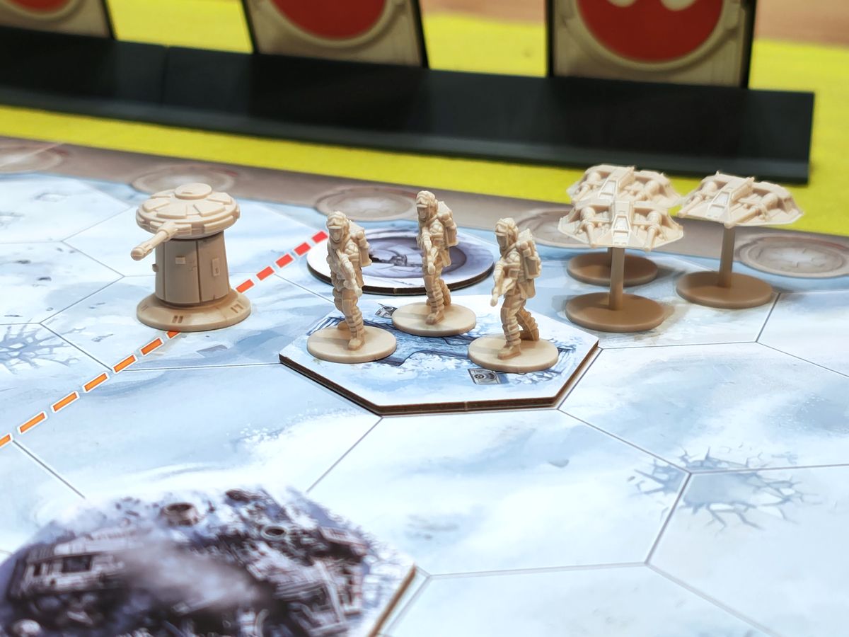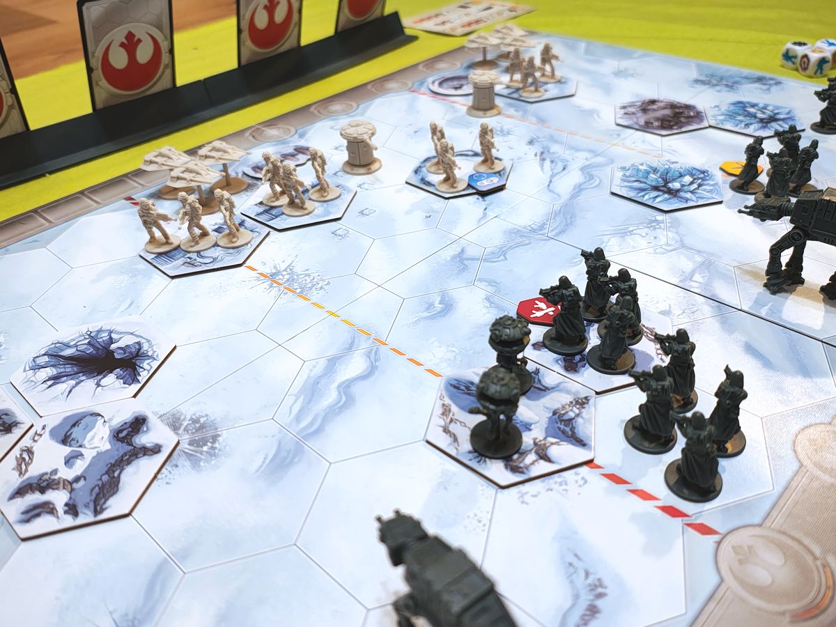 Ciekawym rozwiązaniem jest fakt, że liczebność oddziału symbolizuje jego “żywotność”. Piechota składa się z 3 lub 4 żołnierzy (w zależności od strony), AT-ATy działają pojedynczo (ale żeby je zniszczyć trzeba dwa razy z rzędu wyrzucić odpowiedni symbol), a śmigacze trójkami. Każde trafienie zabiera jedną figurkę, a zniszczenie ostatniej oznacza utratę całego oddziału i zdobycie punktu przez przeciwnika. Jednocześnie siła ognia jednostki jest niezmienna i zależy wyłącznie od odległości między pionkami.