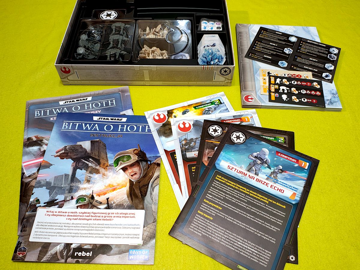 Jakby tego było mało, w pudełku znajdziemy cztery “kampanie”, czyli zestaw instrukcji pozwalających na połączenie różnych scenariuszy w ciąg fabularny, dodatkowo modyfikując ich zasady, wprowadzając nowe elementy (na przykład karty bohaterów) i uzależniając kolejność rozgrywania poszczególnych starć od wyników poprzednich potyczek. Jest więc co robić i z pewnością Bitwa o Hoth zapewnia wiele godzin urozmaiconej rozgrywki.