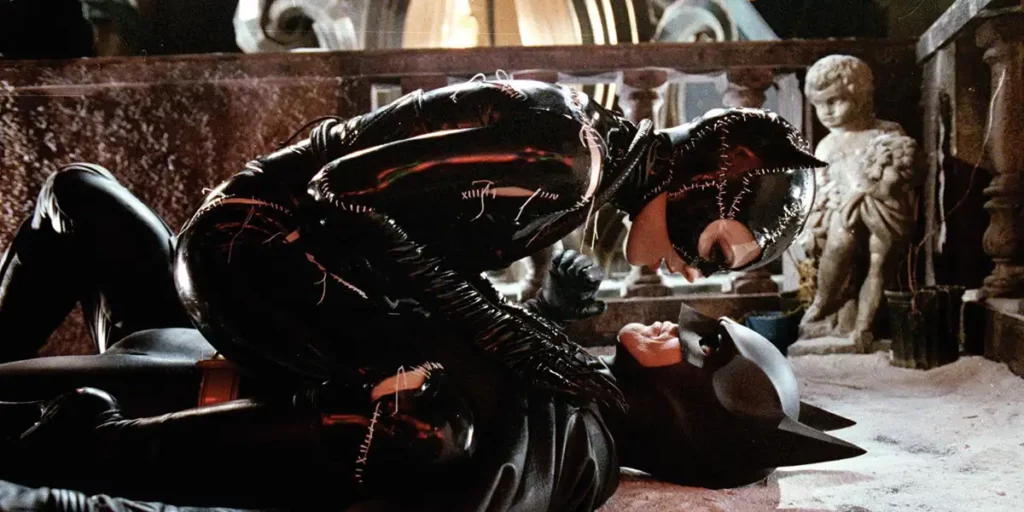 Catwoman Pfeiffer jest zmysłowa, ale jej erotyzm ma w sobie coś agresywnego, nerwowego, niemal autodestrukcyjnego. To seksualność jako broń i krzyk rozpaczy jednocześnie. Burton i Pfeiffer tworzą postać, która wyprzedza swoje czasy: feministyczną, tragiczną, ale nie sentymentalną. Jej relacja z Batmanem nie jest romansem, lecz spotkaniem dwóch złamanych ludzi, którzy rozpoznają w sobie to samo pęknięcie. To powinno ich połączyć, ale oboje wiedzą, że ta baśń nie będzie mieć słodkiego zakończenia.
