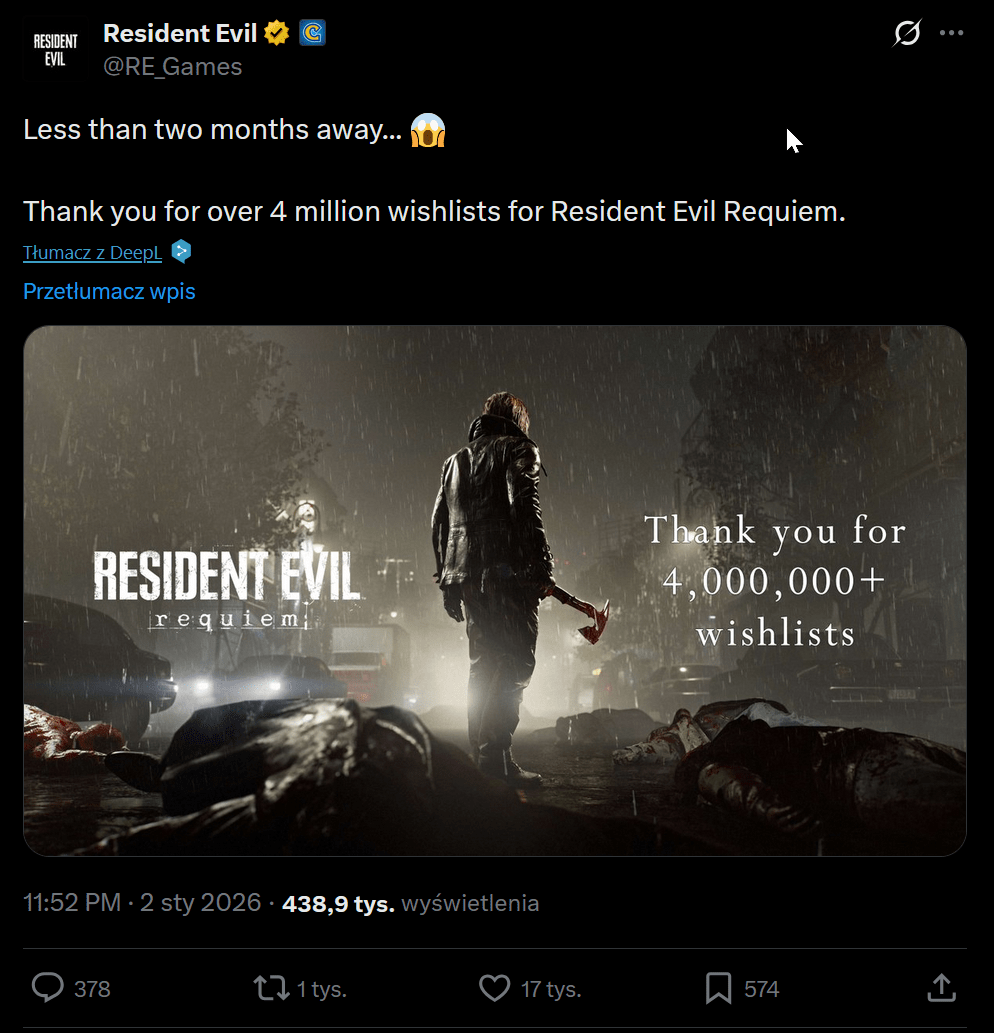 - Resident Evil Requiem przekroczyło 4 miliony zapisów na listach życzeń, co podobno jest rekordem marki (premiera 27 lutego)