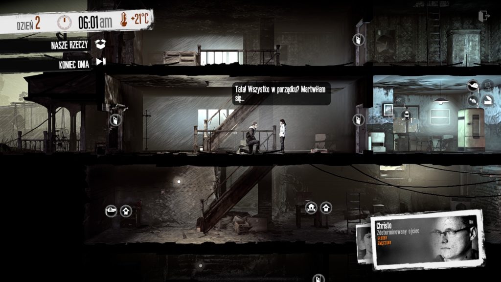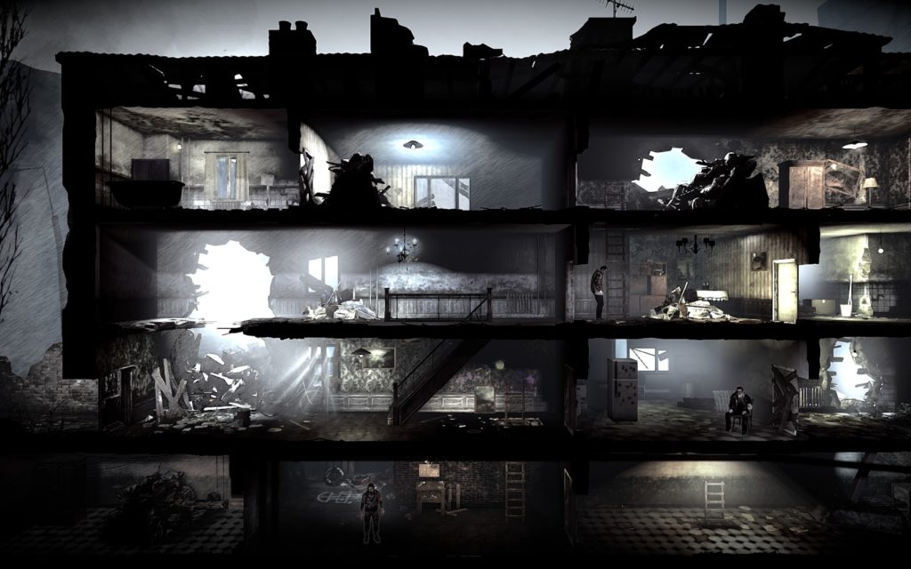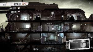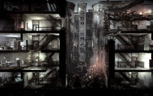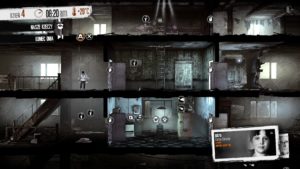 Jak nazwać tę grę? Symulator przetrwania w strefie wojny? Strategia w której zarządzamy małą wspólnotą cywilów? Najprościej chyba opowiedzieć do czego – poza przeżywaniem losu swoich bohaterów – sprowadza się rola gracza. Będziemy kierować kilkoma postaciami ukrytymi w zdemolowanym budynku. W ciągu dnia wszyscy nas bohaterowie odpowiadają za organizowanie schronienia. W pierwszych dniach na pewno zdecydujecie się oczyścić je z gruzu i stert śmieci albo przeszukać szafy i komody. W kolejnych będziecie produkować niezbędne wyposażenie wnętrz, zabijać dziury w ścianach czy tez produkować narzędzia. Pojawi się również możliwość stworzenia wyposażenia pozwalającego przetrwać okrucieństwa wojny. To również w tej fazie będziemy zaspokajać potrzeby członków naszej grupy. Są przecież zmęczeni, głodni, ranni albo chorzy. Nasze decyzje mogą doprowadzić ich do załamania nerwowego, któremu również trzeba zapobiegać. Ale to nie wszystko. Bo właśnie za dnia pojawią się pod naszymi drzwiami goście. Niektórzy będą oczekiwać pomocy, inni będą chcieli handlować, a jeszcze inni zechcą przyłączyć się do naszej grupy. Tylko od nas będzie zależało jaką decyzję podejmiemy. Każda będzie miała swoje konsekwencje.