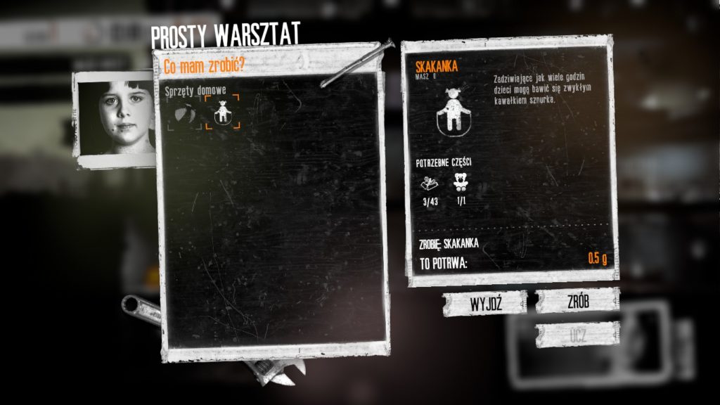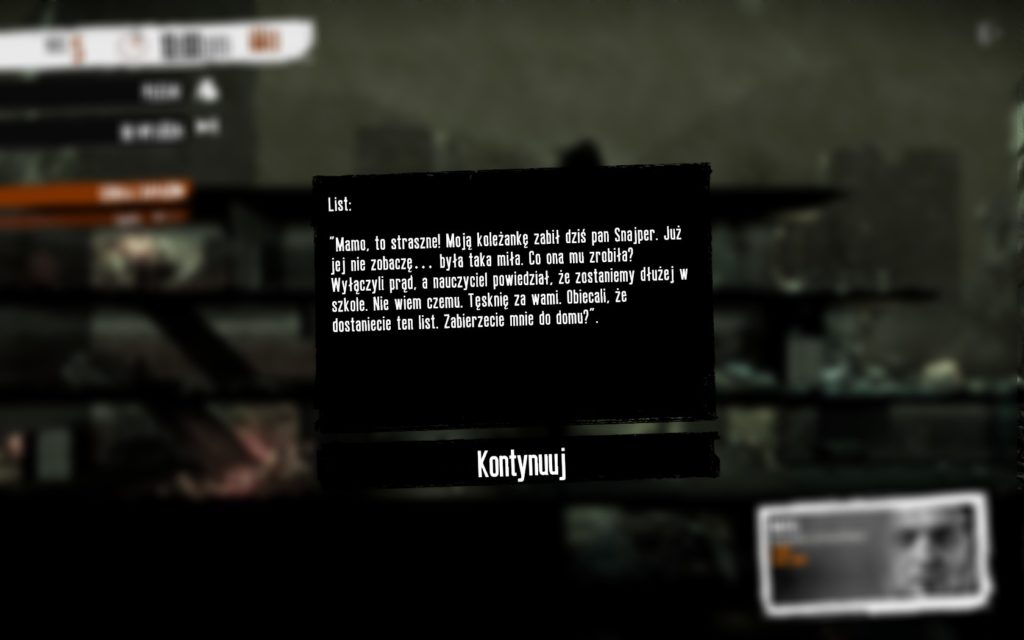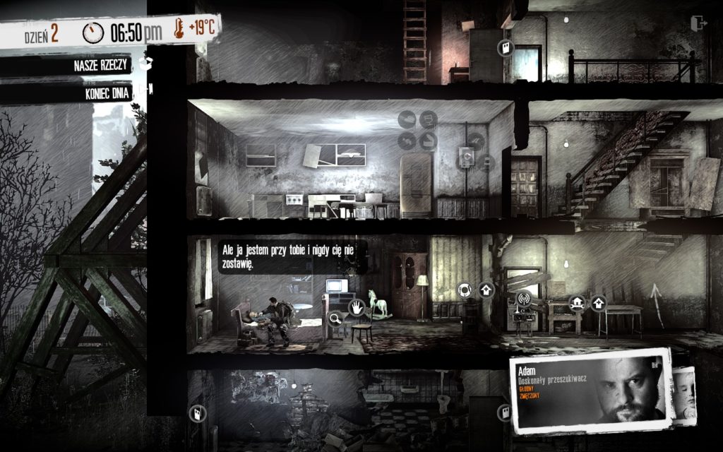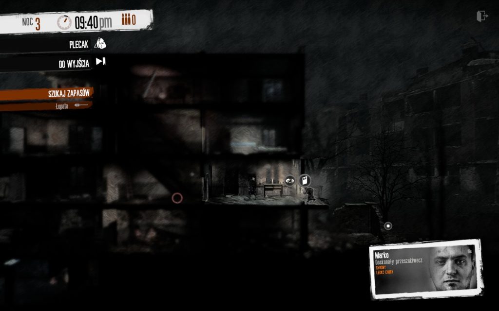 Na mapie lokacji trzeba zachowywać się zgoła inaczej niż w naszym domu. W większości przypadków to my będziemy intruzami, dlatego zaglądanie przez dziurkę od klucza powinniście uznać za priorytet. W końcu możemy się nadziać na kogoś uzbrojonego. Przeszukiwania lokacji trzeba dokonywać w selektywny sposób, bo nawet wysyłając najlepszego człowieka z ekipy nie wyczarujemy nieograniczonej pojemności plecaka. Stąd też konieczność powrotu do wybranych miejsc i wynoszenia kolejne niezbędne do funkcjonowania w oblężonym mieście rzeczy. Czasem poznamy też konsekwencje naszego szabrowania. Nieraz natkniemy się na chwytające za serce opisy czy też sytuacje wyciągające nas ze strefy komfortu. Bo jak inaczej nazwać np. notatkę w szpitalu o skutku bombardowań, mówiącą, że największe straty poniósł oddział… pediatrii. Nawet wiedząc że to tylko gra komputerowa, pewnych decyzji zwyczajnie nie potrafiłem podjąć… A gdy już się decydowałem, gra szybko dawała mi do zrozumienia co zrobiłem, wpędzając moich bohaterów w depresję.