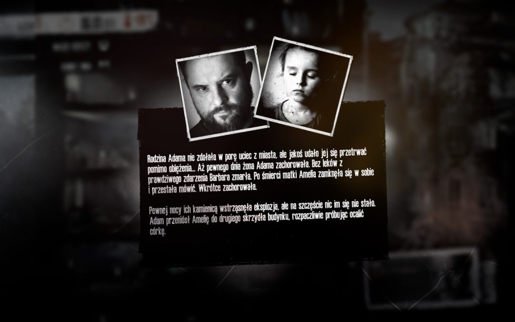 „Stories” to cykl fabularnych opowieści do gry „This War of Mine”. Obecnie dostępna jest tylko jedna historia – „Father’s Promise” (w tej chwili mamy już 3 historie – dwie kolejne miały premiery w 2018 i 2019 roku – przyp. DaeL). Przedstawia ona losy Adama i jego córki. Rozgrywkę rozpoczynamy w zrujnowanej części domu z bardzo chorą dziewczynką i jej ojcem starającym się zapewnić bezpieczeństwo. Ostrzegam, że dalsza część opisu fabuły zawiera drobny spoiler. Czytacie więc na własną odpowiedzialność.
